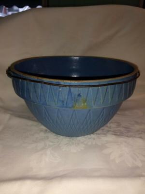 Vintage pottery stoneware crock blue bowl with wire handle!