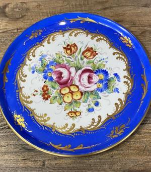 Old Paris Porcelain 12 3/4” Cake Plate Or Charger Royal Blue Flowers Heavy Gold