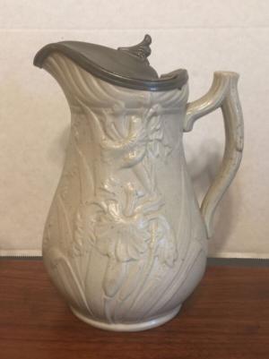 Antique T. Booth 8 1/4” Salt Glaze Syrup Pitcher Embosed Iris Excellent