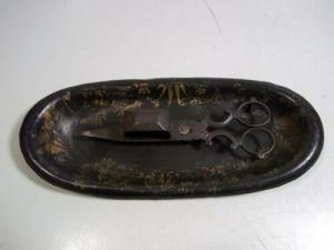 ANTIQUE CANDLESNUFFER AND TOLEWARE TRAY