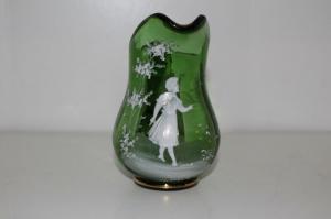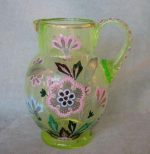 Rare Victorian Enameled Vaseline Art Glass Small Pitcher Hand Painted