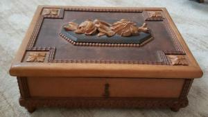 Large antique handmade carved wood Tramp Art wooden box trunk 1800s Roses