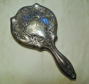 ANTIQUE VICTORIAN STERLING SILVER ART NOUVEAU REPOUSSE HAND MIRROR 10" FLOWERS