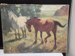 ANTIQUE OIL PAINITNG WILLIAM BIRCHFIELD BRIDGE SIGNED MARES HORSES IN FIELD