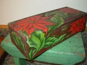 | Flemish Art Old PYROGRAPHY Wood Poinsettia Christmas Box - EXQUISITE |