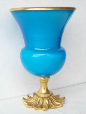 | VTG OLDER PEACOCK BLUE & CASED WHITE GLASS BRONZE OR BRASS ORMOLU VASE URN |