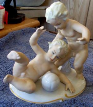 | VINTAGE SCHAUBACH KUNST WALLENDORF GERMANY FINE PORCELAIN NUDE BOYS SOCCER BALL |