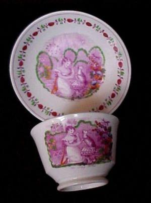 | "The Play Fellow" PINK LUSTER CUP & SAUCER - GIRL & CAT pearlware - excellent |