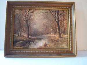 | Vintage 1956 Robert Woods Stream & Woods Painted Gold Frame Wall Hanging Picture |