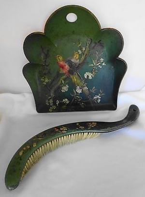 | Antique Victorian French Butler Crumb Tray Brush Paper Mache Birds Hand Painted |