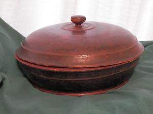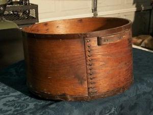 | Antique Wooden Pantry Box Round Nailed Seam Shaker? Primative Banded with Handle |