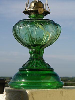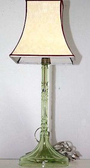 | ANTIQUE ART NOUVEAU VASELINE GLASS PEDESTAL TABLE LAMP W/ CHAIN PULL SOCKET. |