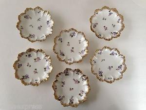 | 6 Antique Art Nouveau Scalloped Plates Gold & Violet Floral A.K. Limoges France |