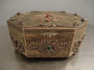 | Antique Metal Filigree Ormolu Jeweled Box |