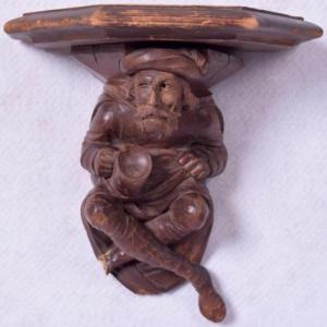 | 19c Antique Black Forest Carved Wooden Shelf Man Holding a Beer GREAT DETAIL |
