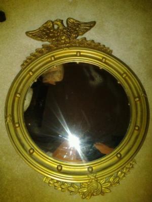 | ANTIQUE FEDERAL STYLE CONVEX MIRROR 22" DIA. BY 30" TALL - EAGLE TOP & 13 BALLS |