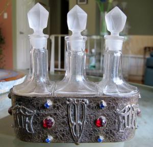 | Vintage Czech Jeweled Stand & Three Glass Perfume Bottles |