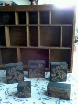 | Vintage wood printers type set tray letter press drawer with 5 blocks |