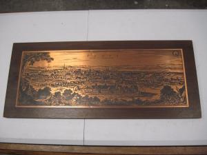 | Very Large Antique Vintage Copper Etching Inlay Wood Paris 1620 City View |