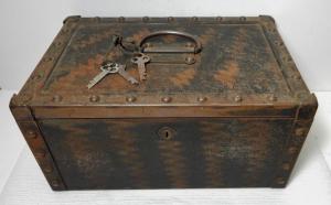 | 1900''s ERIE ART METAL Co No 75 COPPER PLATE RIVETED STRONG BOX STRONGBOX W/ KEYS |