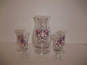 | Stunning Hand Painted Enamel on Glass Liquer Pitcher & 4 Stem Cordial Glasses |