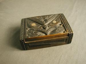 | ANTIQUE TRINKET BOX W/ LID - GENUINE MAORI - CARVED TAPU - DRAGON FACE - gh |