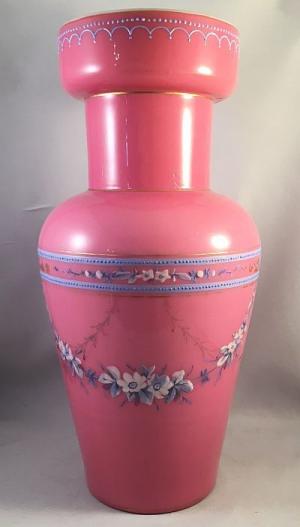 | Large Antique Victorian Pink Opaline Bristol Cased Glass Vase Enameled Flowers |