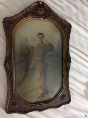 | ANTIQUE PATRIOTIC MILITARY CONVEX BUBBLE GLASS FRAME w/ Vtg Military Photo |