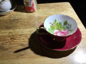 | Superb Ansley large cabbage rose burgundy cau and saucer |
