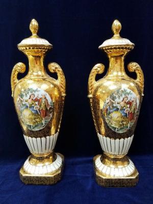 | PAIR OF BEAUTIFUL VINTAGE GOLD GILT URN STYLE VASE W/COLONIAL VICTORIAN SCENE |