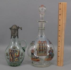 | 2 Antique Hand Blown Decanter Bottles Enamel Painting  Dickens Tony & Sam Weller |