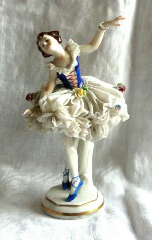 | Large Dresden Old Volkstedt Germany Ballerina Girl in Blue w/Rose Lace Figurine |