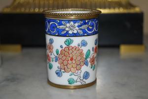 | OLD FRENCH CHANTILLY SMALL BRONZE MOUNTED HAND PAINTED PORCELAIN TALL CUP VASE |