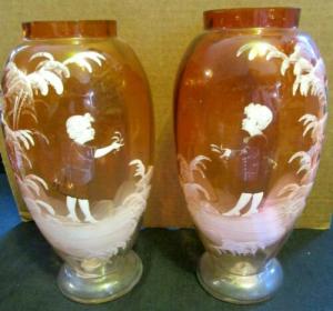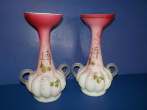 | 2 SUPER LIGHT PEACH COLORED VICTORIAN MARY GREGORY MATCHED VASES 9.5" TALL MINT |