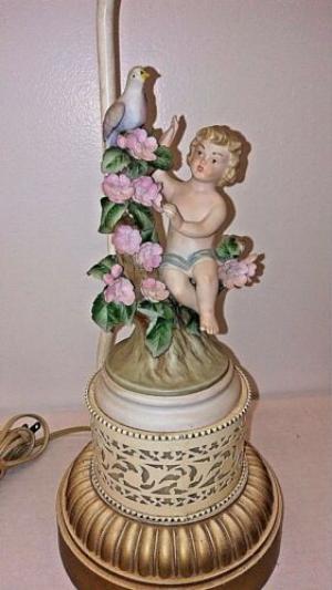 | Antique French Table Lamp Porcelain Tole Boudoir Cherub Flowers 1920''s Bird |