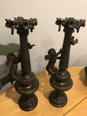 | Vintage Candlestick Holders Frabication Francaise Paris France Bronze Cherubs |