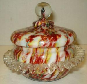 | Antique Victorian Blown Dish W/ Lid Applied Clear Ruffle on Cased Spatter Glass |