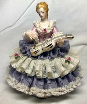| Dresden Lace Figurine Lady Seated Playing Guitar - Purple, White & Pink |