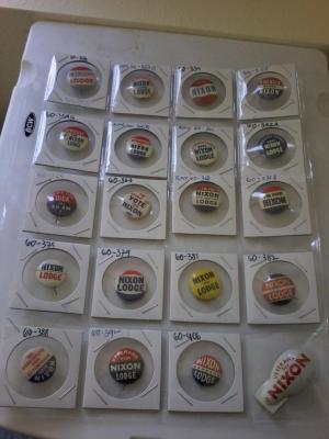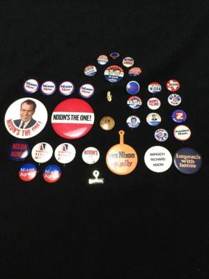 31 Nixon pin backs, 2 Lapel pins, and 2 Folding tab pin backs
