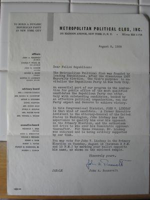 Metropolitan Club Letter Promoting John V Lindsay 1958