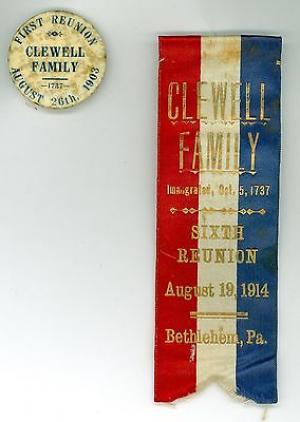 Vintage 1903 Clewell Family Reunion Pinback Button & 1914 Clewell Reunion Ribbon