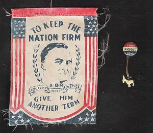 2 FDR Franklin D. Roosevelt 1940s campaign items: cloth flag, pin w/donkey