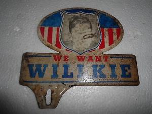 Vintage 1940 WE WANT WILKIE president ORIGINAL LICENSE PLATE TOPPER Republican