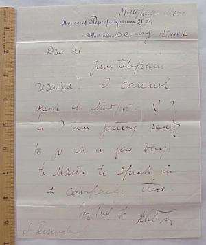 1884 Blaine Campaign Letter US Representative John D Long Massachusetts Governor