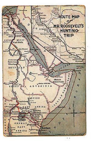 POSTCARD 1909 MAP of AFRICA OUTLINING THEODORE ROOSEVELT'S HUNTING TRIP1909-10