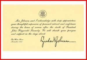 Thank You Card President Lyndon Johnson re Kenney Assassination
