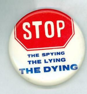 Vintage 1970s anti-Vietnam War Stop Spying Lying Dying Nixon Pinback Button