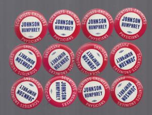 1964 LBJ JOHNSON SCIENTISTS ENGINEERS 1 3/4" CELLULOID RED CAMPAIGN BUTTONS - 12
