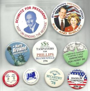 COLLECTION OF 9 THIRD PARTY POLITICAL PINS, McCARTHY, BUCHANAN, SCHMITZ