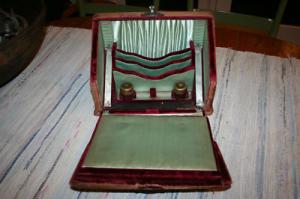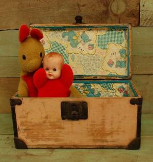 Antique Pink WOOD Baby Doll TRUNK Chest vtg Lining PRIMITIVE Box Metal Hardware